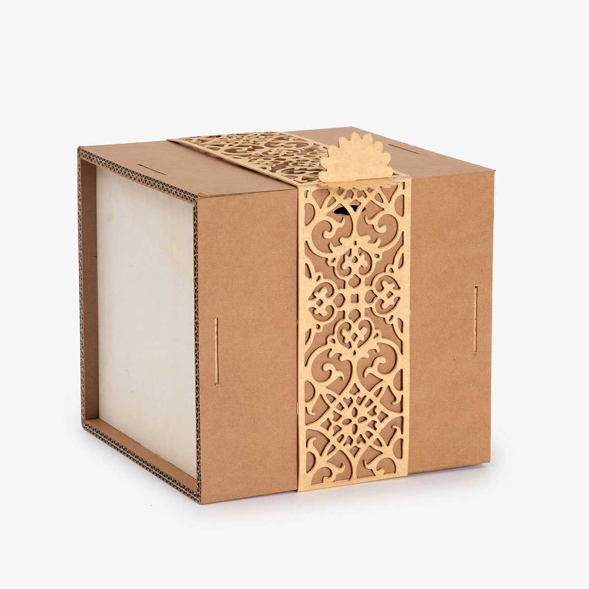 La sua forma geometrica, netta e precisa, cattura immediatamente l’attenzione, trasmettendo un’eleganza senza tempo. Il vero segreto di questa soluzione risiede nella sua fascia, realizzata con carta Fedrigoni di altissima qualità, disponibile in sette diversi colori, o in “carta legno” naturale per un tocco ancora più distintivo. La texture damascata, emblema dell’eleganza senza tempo è ispirata alla tradizione artigianale dei tessuti pregiati. Questa texture, finemente “ricamata” sulla fascia aggiunge profondità e raffinatezza alla confezione. Ogni trama, ogni motivo, è studiato con cura per creare un effetto visivo e tattile che cattura l’attenzione e lascia un’impressione indelebile.